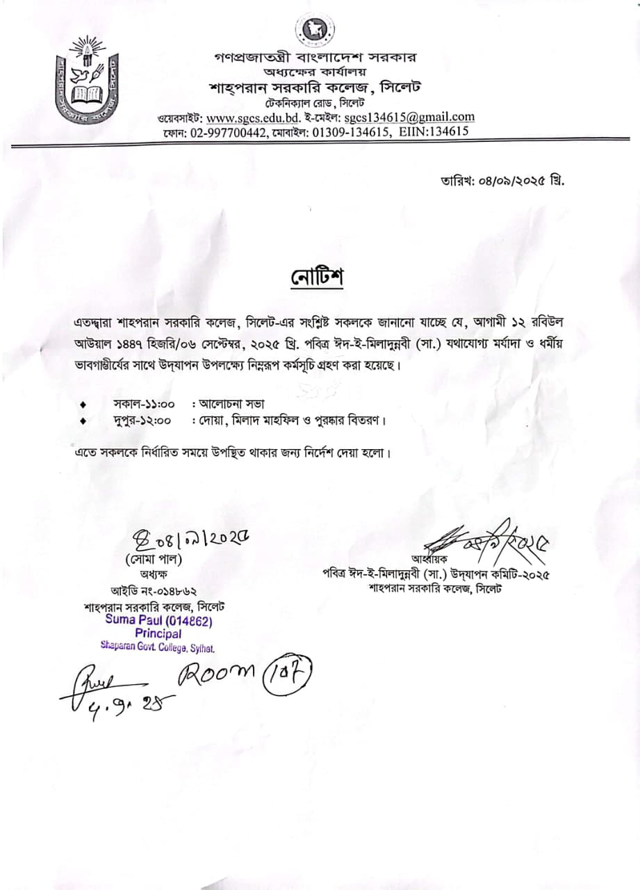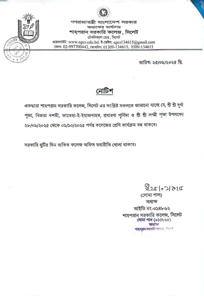 শ্রী শ্রী দূর্গা পূজা, বিজয়া দশমী, ফাতেহা-ই-ইয়াজদাহম, শ্রী শ্রী লক্ষ্মী পূজা ও প্রবারণা পূর্ণিমা উদযাপন উপলক্ষ্যে ক্লাসসমূহ বন্ধের বিজ্ঞপ্তি : |