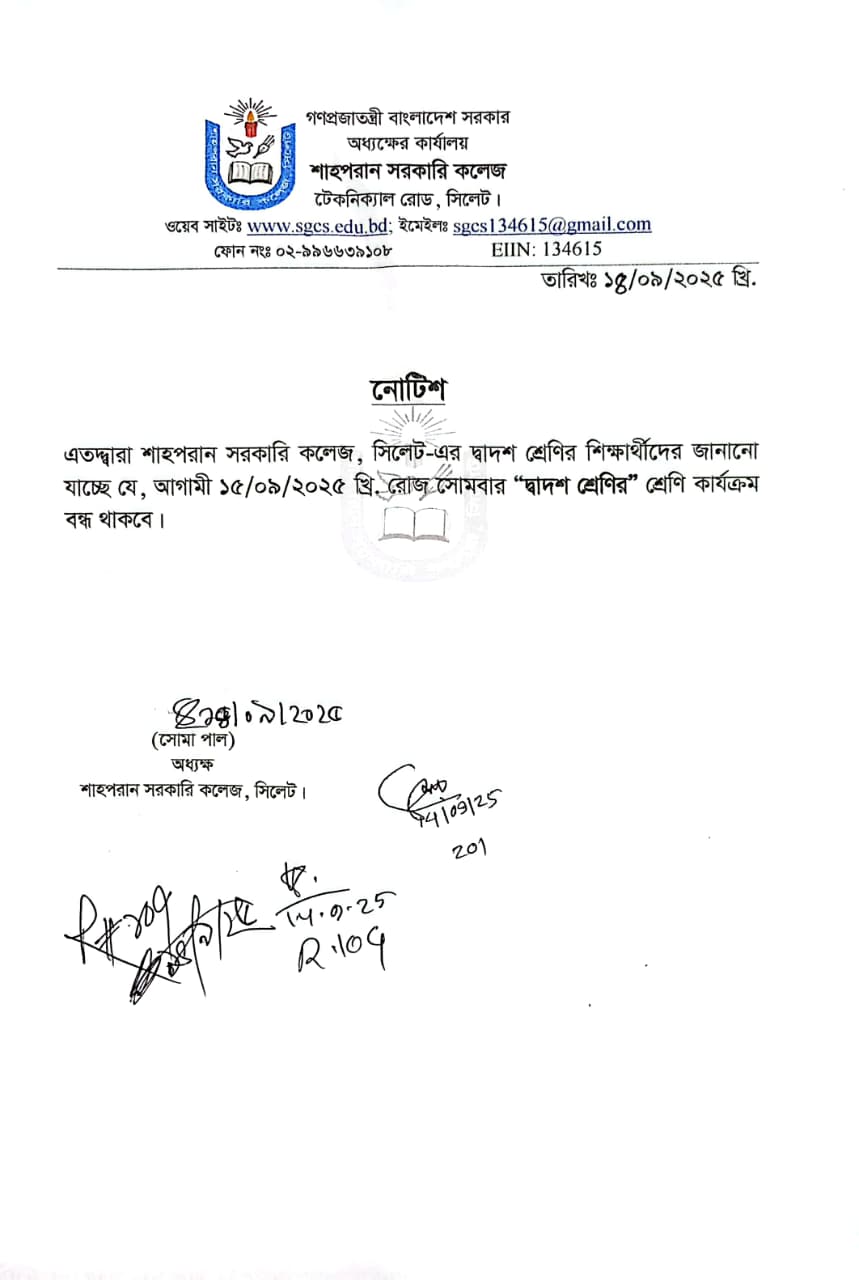 দ্বাদশ শ্রেণির শিক্ষার্থীদের ক্লাস বন্ধের নোটিশ |