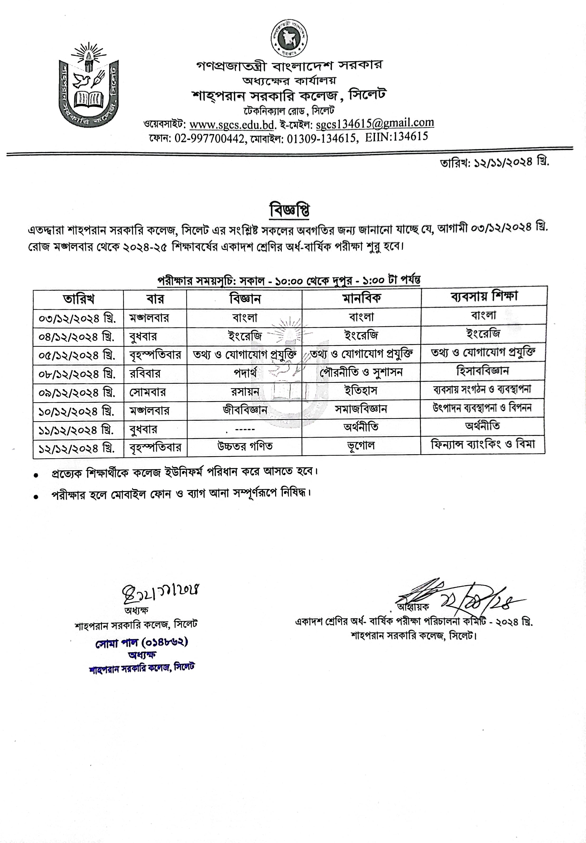 একাদশ শ্রেণির বার্ষিক পরীক্ষার রুটিন-২৫ |