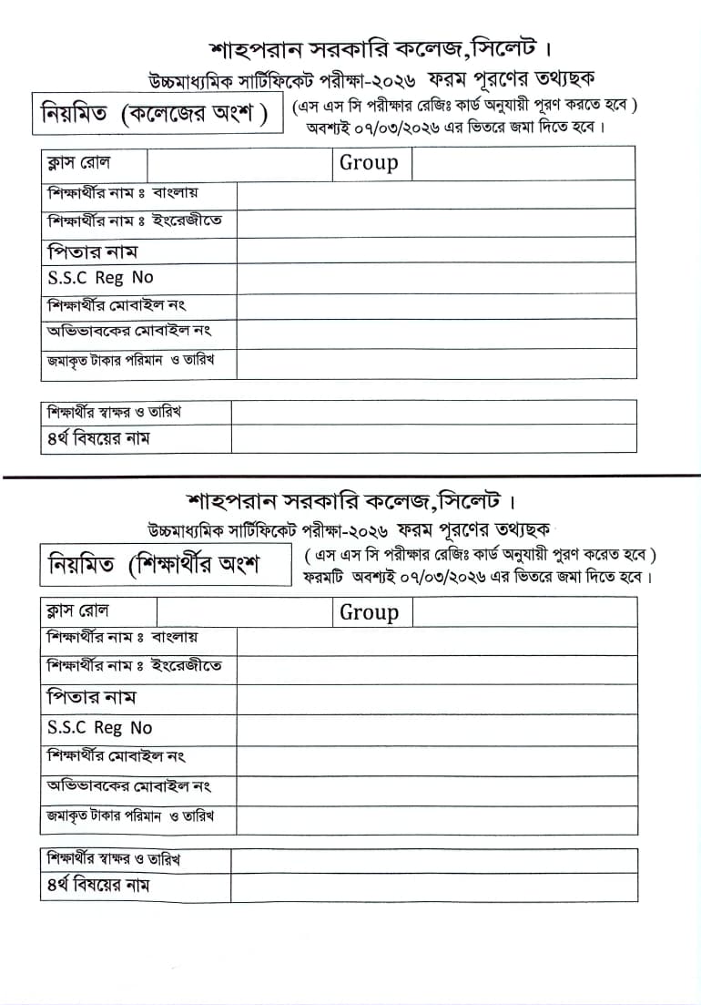 এইচ এস সি পরীক্ষার নিয়মিত শিক্ষার্থীদের ফরম ফিলাপ ফরম-২০২৬>